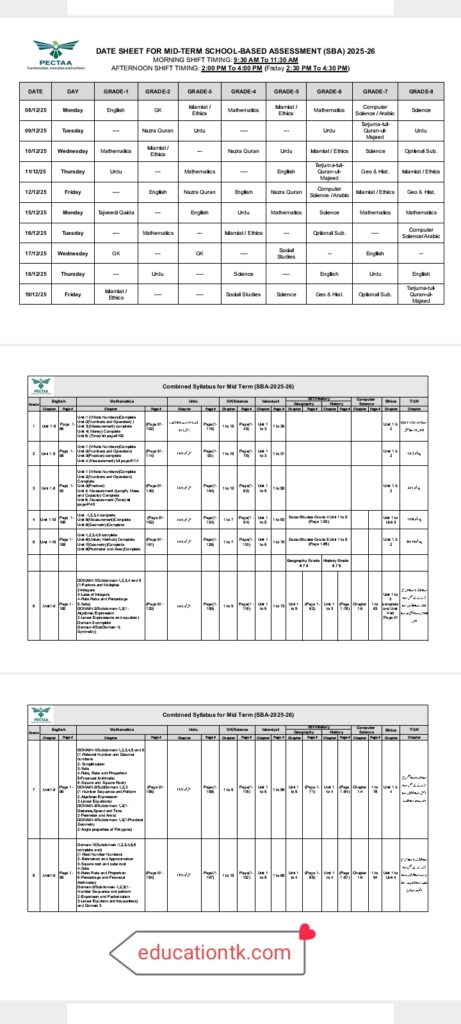 The **Punjab Education, Curriculum, Training and Assessment Authority (PECTAA)** has officially released the comprehensive guide for the **Mid-Term School-Based Assessment (SBA) 2025-26**. If you’ve been looking to **get from the pdf file** the key dates, syllabus details, and assessment patterns, you’re in the right place. This year brings a significant change: a merger of the First-Term SBA with the Mid-Term Assessment due to extended summer vacations.